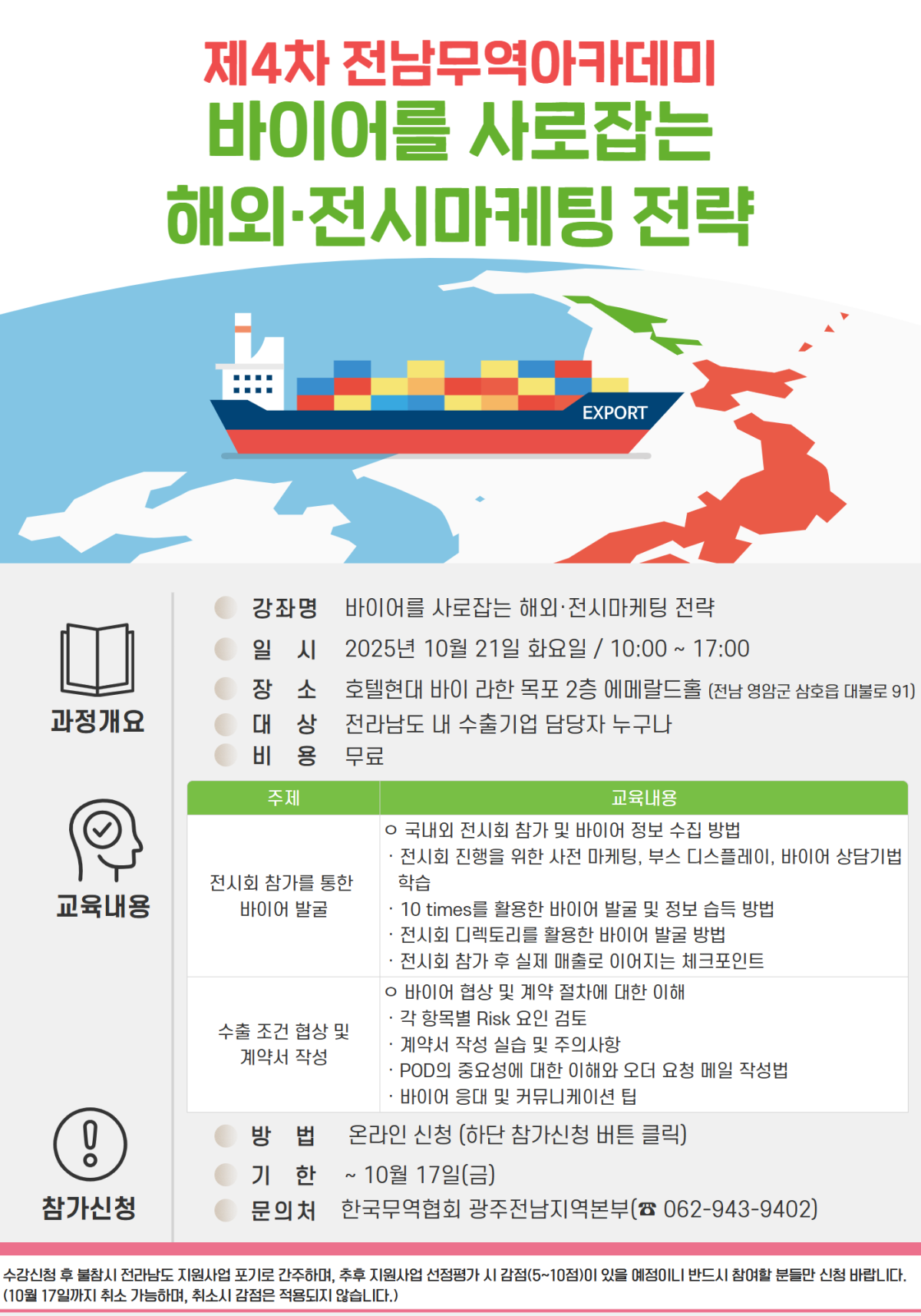 동북아를 넘어서 세계로 수출하는 전라남도! 공지사항 HOME 알림마당 수출정보망소개 알림마당 사업신청 통상애로센터 소통마당 바이 전라남도 공지사항 수출지원시책 공지사항 전남수출통계 수출동향 해외동향 유관기관 수출지원사업 안내 2025년 제4차 전남무역아카데미 모집(바이어를 사로잡는 해외·전시마케팅 전략/ 영암 라한호텔) 2025-10-01 1. 교육일정 : 10. 21.(화) 10:00~17:00 / 호텔현대 바이 라한 목포 2층 에메랄드홀(전남 영암군 삼호읍 대불로 91)2. 신청기한 : ~10.17.(금) ※ 모집 인원 초과 시 조기에 신청 마감될 수 있음3. 신청방법 : 한국무역협회 광주전남지역본부(http://gj.kita.net/)공지사항에서 신청 목록