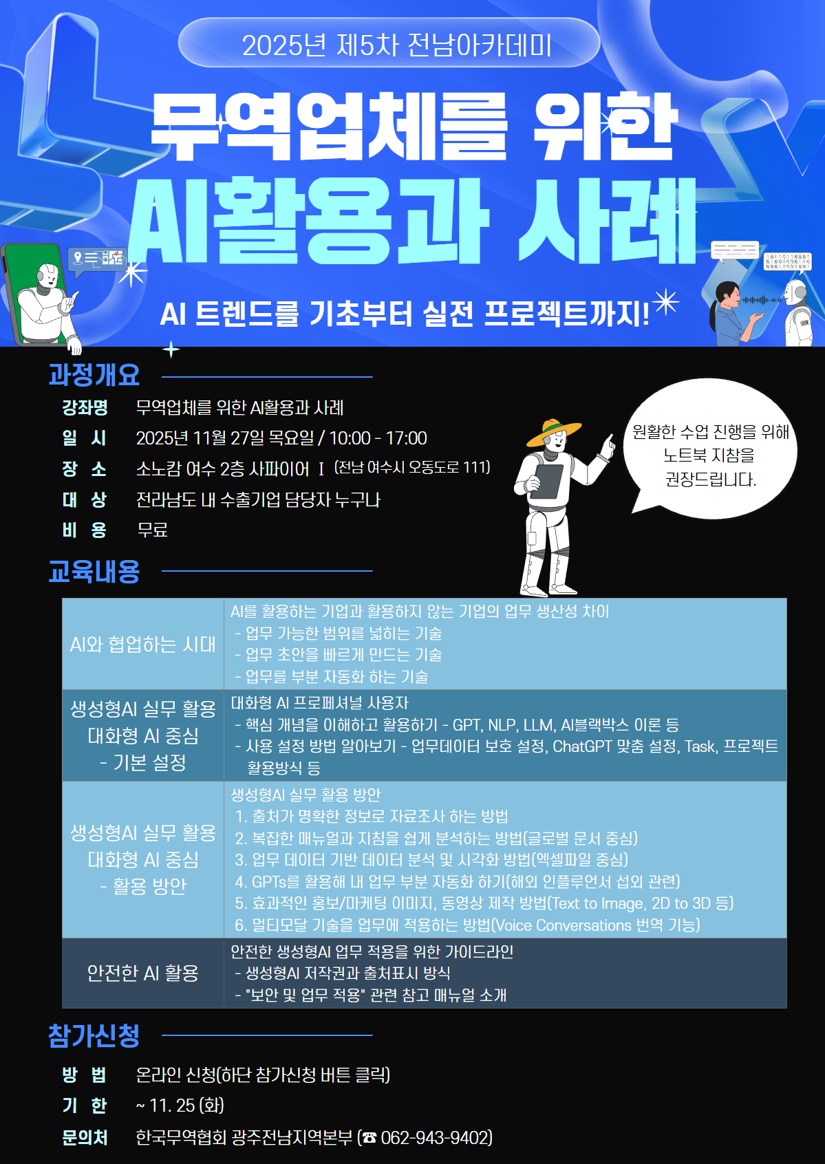 동북아를 넘어서 세계로 수출하는 전라남도! 공지사항 HOME 알림마당 수출정보망소개 알림마당 사업신청 통상애로센터 소통마당 바이 전라남도 공지사항 수출지원시책 공지사항 전남수출통계 수출동향 해외동향 유관기관 수출지원사업 안내 2025년 제5차 전남무역아카데미 모집(무역업체를 위한 AI활용과 사례/ 여수 소노캄) 2025-11-10 첨부파일 제5차 전남무역아카데미 안내포스터 (2).png : 614.0KB 1. 교육일정 : 11. 27.(목) 10:00~17:00 / 소노캄 여수 2층 사파이어(전남 여수시 오동도로 111)2. 신청기한 : ~11.25.(화) ※ 모집 인원 초과 시 조기에 신청 마감될 수 있음3. 신청방법 : 한국무역협회 광주전남지역본부(http://gj.kita.net/)공지사항에서 신청 목록