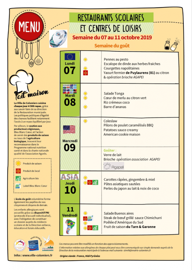 프랑스 학교들에서는 주1회 채식을 의무화하여 채식을 제공하는 것 이외에, ‘맛 주간’ (Semaine du Goût, Taste Week)를 운영하여 아이들이 식문화와 요리문화를 배우도록 하고 있다. 아이들은 미각과 다양한 음식재료에 대해 배우며 여러 음식들을 맛보게 되는데, 이 때 학교에서는 많은 외국 식품 및 요리를 급식으로도 제공한다. 꼴로미에 (Colomiers)에 위치한 학교에서는 월요일에는 유럽, 화요일에는 오세아니아, 수요일에는 미국, 목요일에는 아시아, 금요일에는 남아메리카 식단 제공되었다.